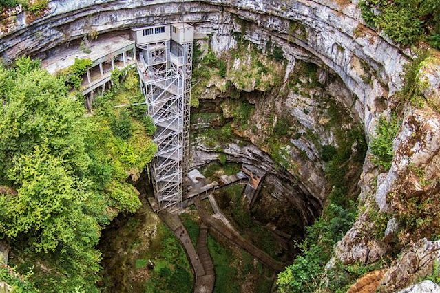 The Padirac Chasm is a cave situated near Gramat, in the Lot department, Occitanie region, France. In French Padirac chasm is called Gouffre de Padirac itself is 338 ft deep, with a diameter of about 33 108 ft. Tourists descend 75 m via a lift or a staircase before entering into the cave system. The Padirac Chasm comprises a subterranean river system that is partly negotiable by boat and is viewed as one of the most extraordinary natural phenomena of the Massif Central. This beautiful cave was created at an undetermined point in time when the roof collapsed into a large internal cavern.