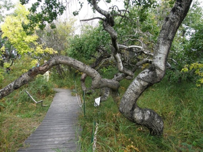 A wooden walkway was constructed through the grove to keep visitors from trampling any new growth. Since the deformity is probable genetic and aspens spread by root suckers, it is likely that all the crooked trees in the grove are clones that originated from a single mutated tree. The grove is at present bounded on all sides by the grid road and a perimeter access road, so the size of the grove is static and is unlikely to continue spreading.
